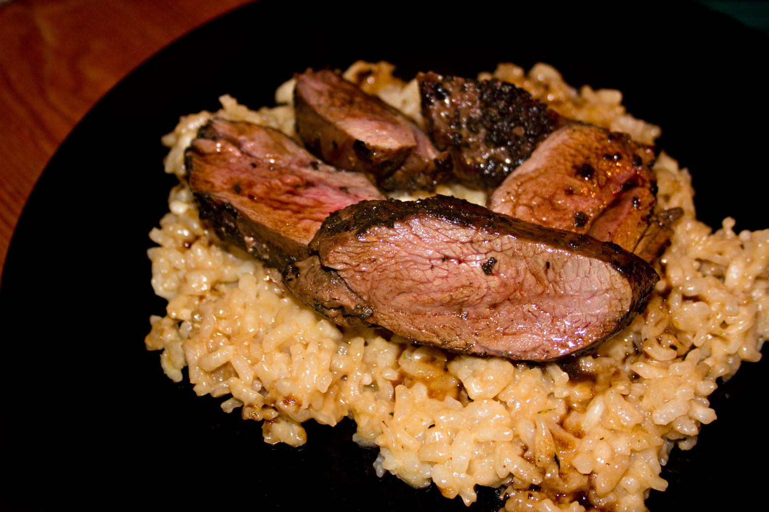 - Das Risotto auf den Tellern verteilen, die Lammlachse aufschneiden und darauf verteilen und mit dem Kaffeefond begießen.