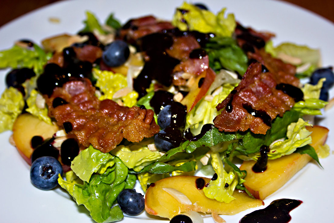 Fruchtiger Sommersalat mit Pfirsich, Heidelbeeren und Bacon